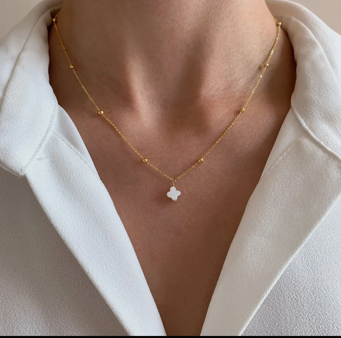 „Filigrane Edelstahl-Halskette – Kleeblatt aus Perlmutt“